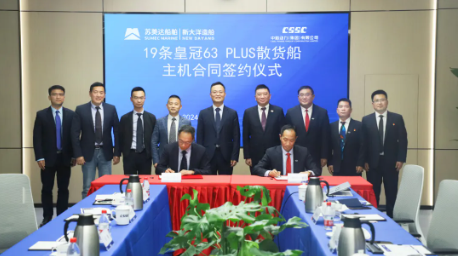 2024年5月15日,蘇美達股份下屬蘇美達船舶有限公司旗下新大洋造船有限公司與中國船舶集團下屬中船動力(集團)有限公司旗下滬東重機有限公司在滬簽訂了19條皇冠63 PLUS散貨船主機合同。蘇美達船舶黨委書記、董事長何雋,黨委副書記、總經理徐斌,財務負責人朱長城,中船動力集團黨委書記、董事長李琤,黨委副書記、總經理邵煜出席簽約儀式,新大洋造船副總經理金文剛與中船動力集團副總經理張仲領分別代表雙方簽字。新大洋造船、中船動力集團市場營銷中心以及滬東重機相關負責人一同參與見證。
