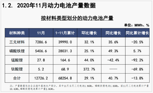 另外,中國汽車動力電池產業創新聯盟發布的數據顯示,11月,我國動力電池產量共計12.7GWh,同比增長40.7%,環比增長29.1%。其中三元電池產量7.3GWh,占總產量57.3%,同比增長35.6%,環比增長32.1%;磷酸鐵鋰電池產量5.4GWh,占總產量42.5%,同比增長49.3%,環比增長25.1%。1-11月,我國動力電池產量累計68.3GWh,同比累計下降13.8%。其中三元電池產量累計40.0GWh,占總產量58.6%,同比累計下降20.5%;磷酸鐵鋰電池產量累計28.0GWh,占總產量41.1%,同比累計上升5.7%。