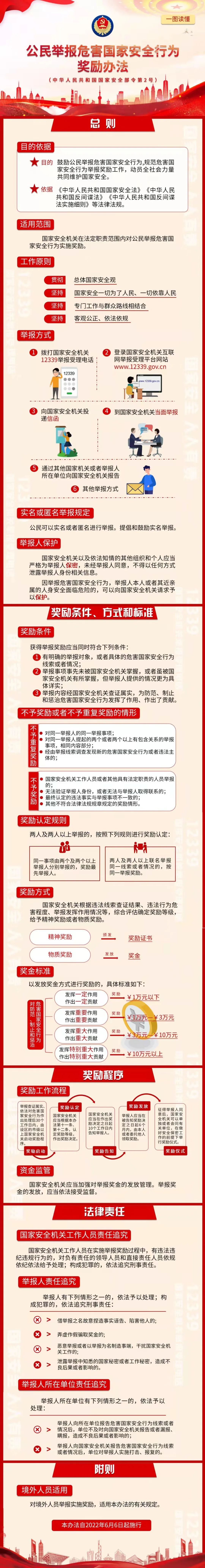 2022年6月6日,國家安全部公布部門規章《公民舉報危害國家安全行為獎勵辦法》。國家安全一切為了人民,一切依靠人民,讓我們行動起來,共做國家安全的守護人!